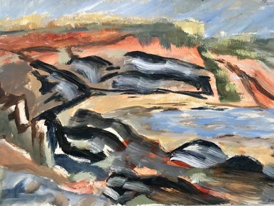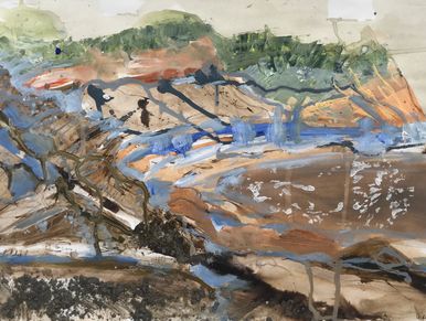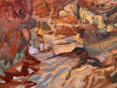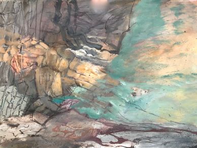 Mixed media including wild pigment, sand, acrylic, ink, collaged walking sketches and monotype imprints of the ancient rock strata